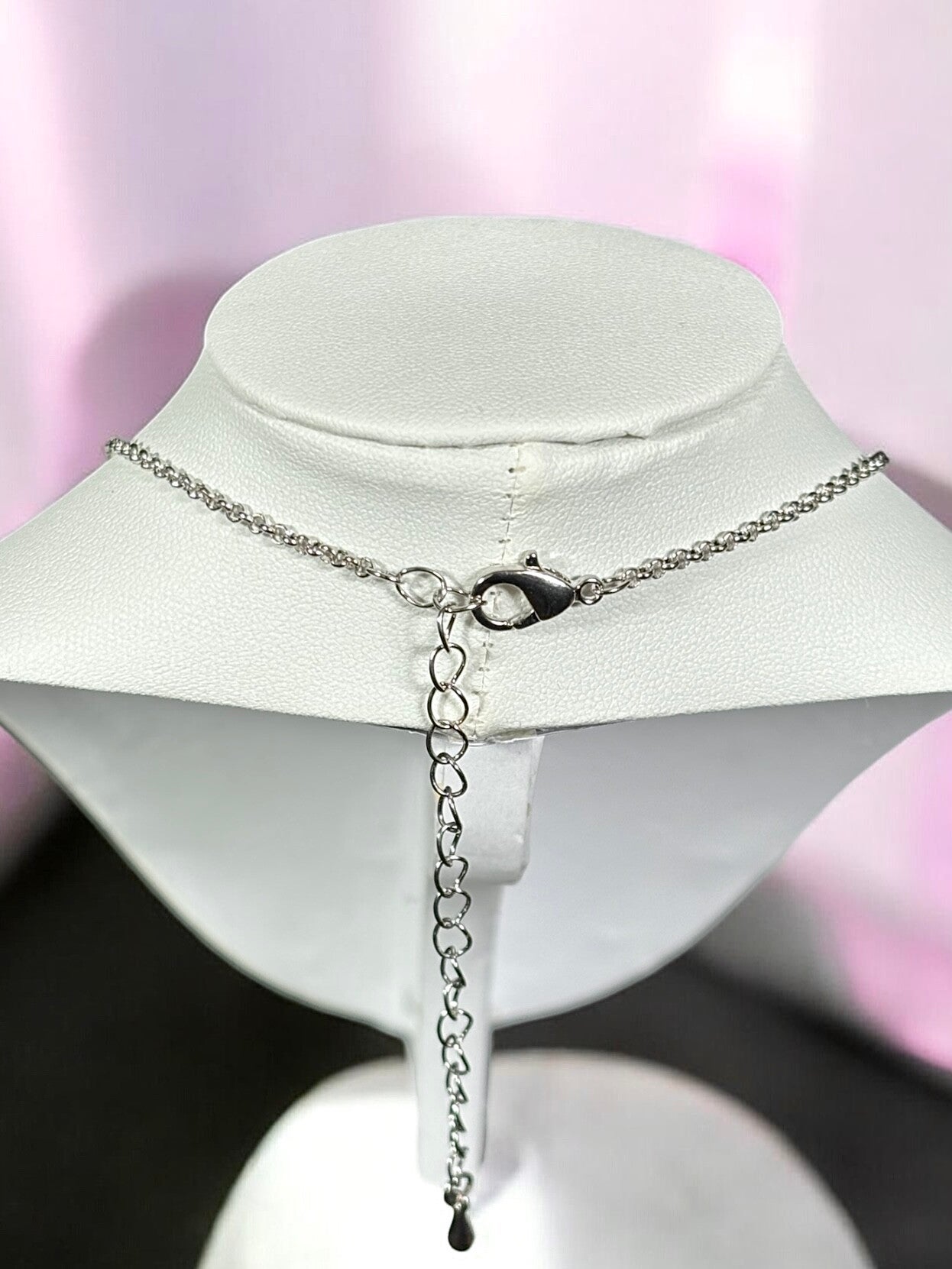 Die Kette ist versilbert und hat eine Länge von 70 cm zuzüglich einer Verlängerungskette mit Karabinerverschluß von 7 cm.